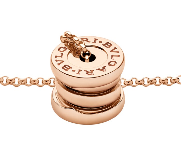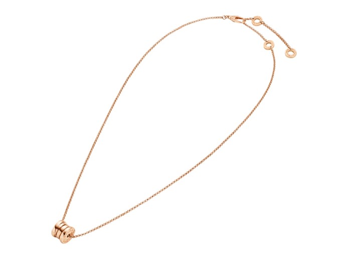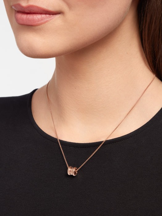 Inspired by the famous amphitheater, the Colosseum, B.ZERO1 embodies Bvlgari's creative vision, a masterpiece of Italian design. Its unique wrap-around design challenges the essence of jewelry's aesthetic, symbolizing the collection's pioneering spirit, where past, present and future are harmoniously embodied in this glorious and magnificent Eternal City. B.ZERO1 18K rose gold necklace with mini pendant.