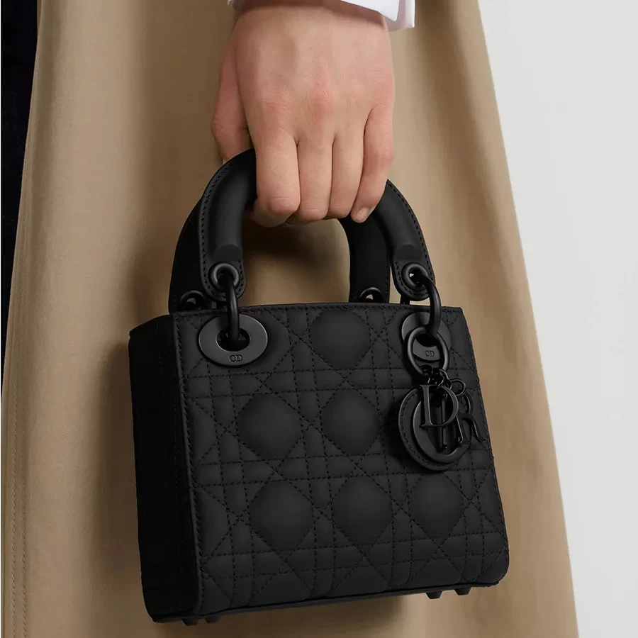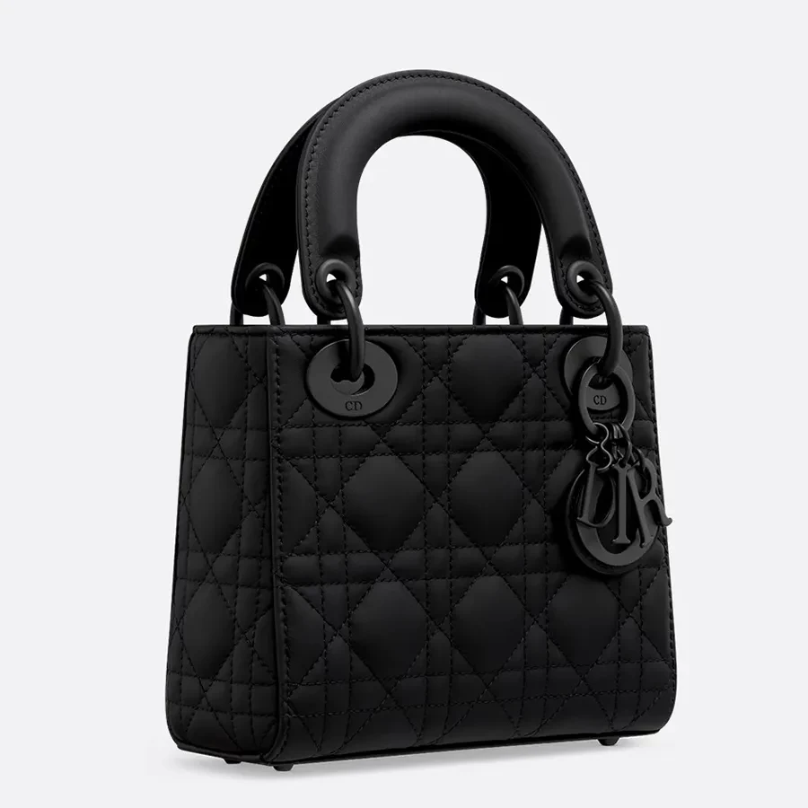 Thiết kế túi kiểu dáng nhỏ nhắn, sang trọng nổi bật với những chiếc charm kim loại chữ "DIOR" mạ cùng tông màu đen làm nổi bật tổng thể. Với dây đeo vai dạng chuối phôi da có thể tháo rời, chiếc túi Lady Dior thu nhỏ này có thể cầm tay hoặc đeo chéo như một người bạn đồng hành lý tưởng cho mọi trang phục.